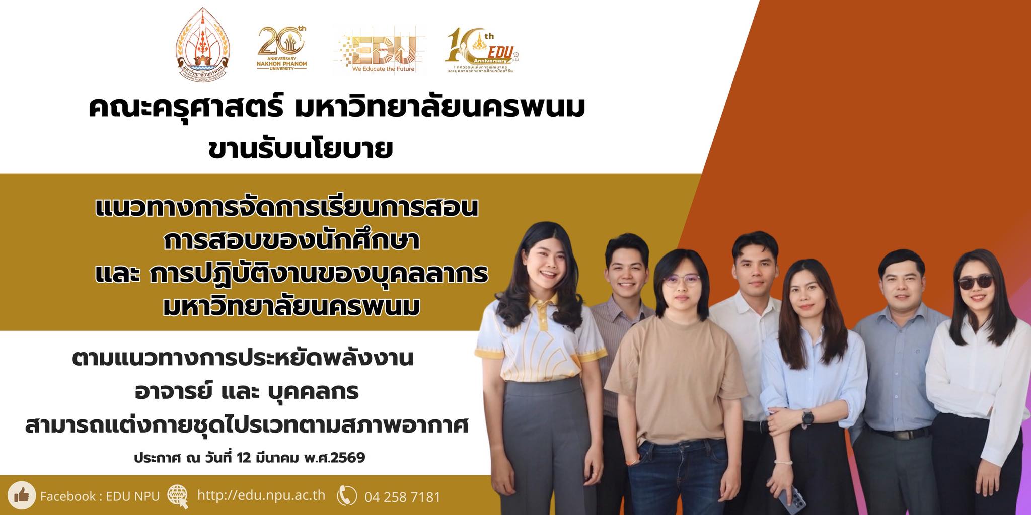 ประกาศ ณ วันที่ 12 มีนาคม 2569 คณะครุศาสตร์ มหาวิทยาลัยนครพนม ประกาศขานรับนโยบายมหาวิทยาลัยนครพนม ในการวางแนวทางการจัดการเรียนการสอน การสอบของนักศึกษา และการปฏิบัติงานของบุคลากร เพื่อให้สอดคล้องกับแนวทางการประหยัดพลังงานและสถานการณ์ปัจจุบัน