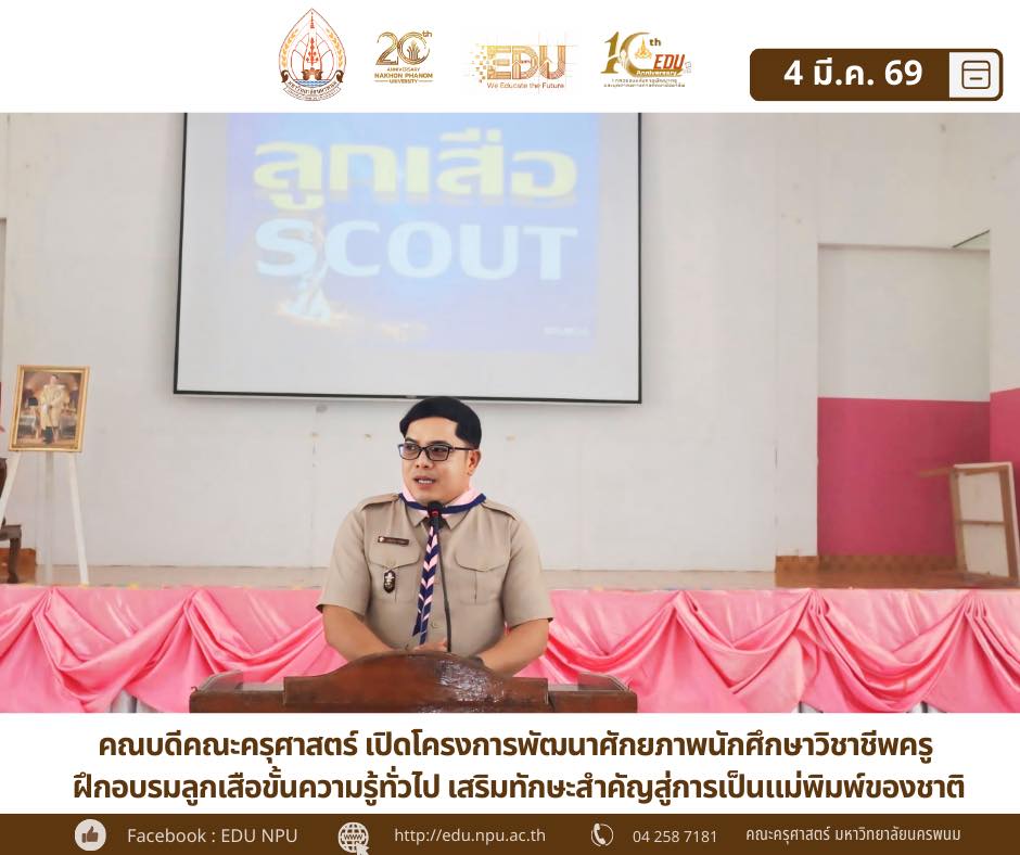 ณ ห้องประชุมโรงเรียนศรีบัวบานวิทยาคม อ.เมือง จ.นครพนม ผู้ช่วยศาสตราจารย์ ดร.เกรียงไกร ผาสุตะ คณบดีคณะครุศาสตร์ มหาวิทยาลัยนครพนม ให้เกียรติเป็นประธานในพิธีเปิด "โครงการพัฒนาศักยภาพนักศึกษาวิชาชีพครู : กิจกรรมอบรมลูกเสือขั้นความรู้ทั่วไป" เพื่อเตรียมความพร้อมให้นักศึกษาวิชาชีพครูมีความรู้ความเข้าใจในกระบวนการทางลูกเสือ และสามารถนำไปประยุกต์ใช้ในการจัดการเรียนการสอนและขัดเกลาเยาวชนในอนาคต