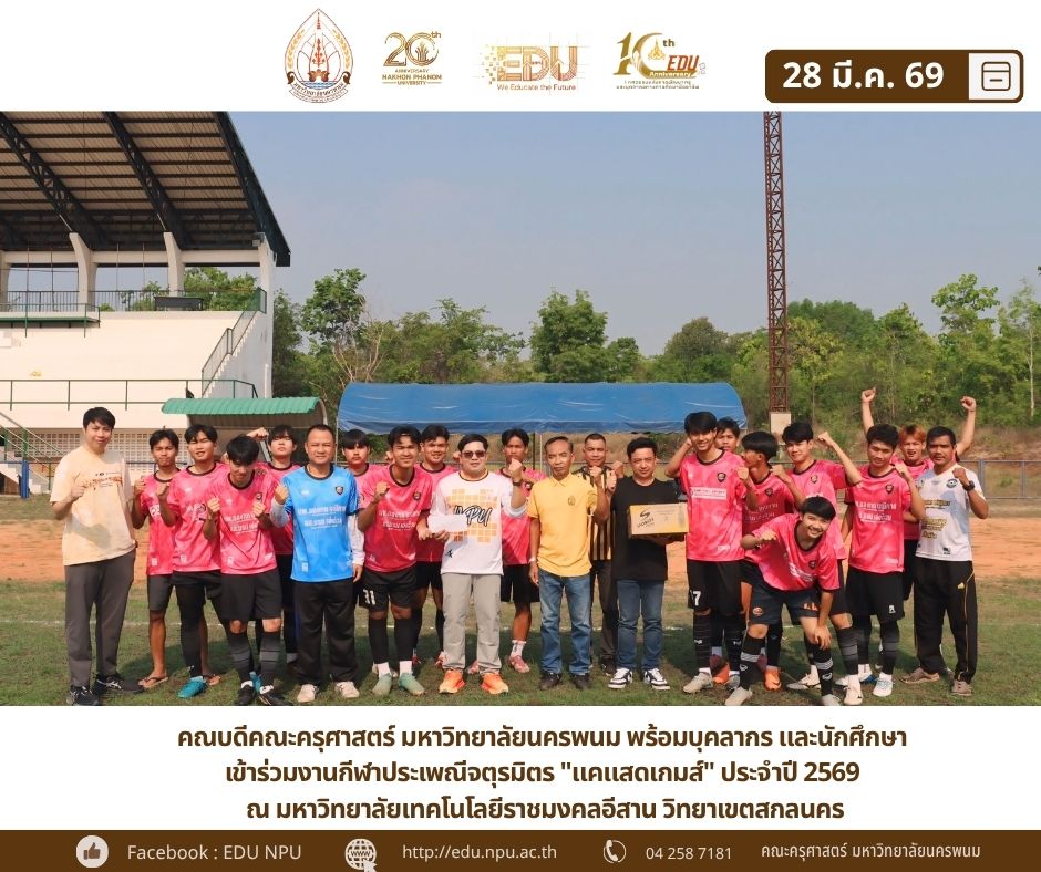 ผู้ช่วยศาสตราจารย์ ดร.เกรียงไกร ผาสุตะ คณบดีคณะครุศาสตร์ มหาวิทยาลัยนครพนม พร้อมด้วย บุคลากร และนักศึกษาคณะครุศาสตร์ เข้าร่วมพิธีเปิดและร่วมแข่งขันในการแข่งขันกีฬาประเพณีจตุรมิตร "แคแสดเกมส์" ประจำปี 2569 และ ท่านคณบดีคณะครุศาสตร์ ได้มอบเงินสนับสนุน พร้อมด้วยเครื่องดื่มชูกำลังและน้ำดื่ม เพื่อเป็นขวัญและกำลังใจให้แก่นักกีฬาของมหาวิทยาลัยนครพนมในการแข่งขันครั้งนี้ด้วย ซึ่งในปีนี้จัดขึ้น ณ มหาวิทยาลัยเทคโนโลยีราชมงคลอีสาน วิทยาเขตสกลนคร