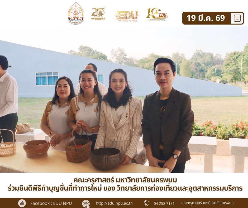 ผู้ช่วยศาสตราจารย์ ดร.เกรียงไกร ผาสุตะ คณบดีคณะครุศาสตร์ มหาวิทยาลัยนครพนม มอบหมายให้ ผู้ช่วยศาสตราจารย์ ดร.พิจิตรา ธงพานิช รองคณบดีฝ่ายบัณฑิตศึกษา พร้อมด้วย อาจารย์ ดร.สุภาวดี กาญจนเกต ผู้ช่วยคณบดีฝ่ายบัณฑิตศึกษา และคณะเจ้าหน้าที่ เป็นตัวแทนคณะเข้าร่วม "พิธีทำบุญตักบาตรและเจริญพระพุทธมนต์" เนื่องในโอกาสย้ายที่ทำการใหม่ของ วิทยาลัยการท่องเที่ยวและอุตสาหกรรมบริการ มหาวิทยาลัยนครพนม