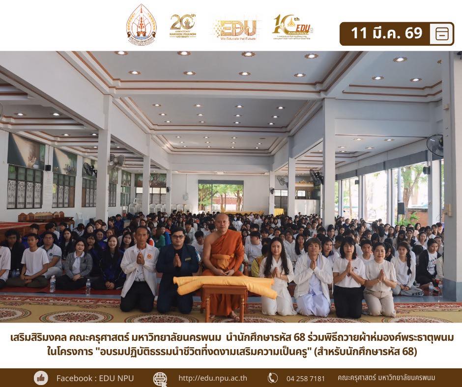 āļ„āļ“āļ°āļ„āļĢāļļāļĻāļēāļŠāļ•āļĢāđŒ āļĄāļŦāļēāļ§āļīāļ—āļĒāļēāļĨāļąāļĒāļ™āļ„āļĢāļžāļ™āļĄ āļ”āļģāđ€āļ™āļīāļ™āļāļīāļˆāļāļĢāļĢāļĄāļ­āļĒāđˆāļēāļ‡āļ•āđˆāļ­āđ€āļ™āļ·āđˆāļ­āļ‡āđƒāļ™āļ§āļąāļ™āļ—āļĩāđˆ 2 āļ‚āļ­āļ‡āđ‚āļ„āļĢāļ‡āļāļēāļĢ "āļ­āļšāļĢāļĄāļ›āļāļīāļšāļąāļ•āļīāļ˜āļĢāļĢāļĄāļ™āļģāļŠāļĩāļ§āļīāļ•āļ—āļĩāđˆāļ‡āļ”āļ‡āļēāļĄāđ€āļŠāļĢāļīāļĄāļ„āļ§āļēāļĄāđ€āļ›āđ‡āļ™āļ„āļĢāļđ" (āļŠāļģāļŦāļĢāļąāļšāļ™āļąāļāļĻāļķāļāļĐāļēāļĢāļŦāļąāļŠ 68) āļ āļēāļĒāđƒāļ•āđ‰āđ‚āļ„āļĢāļ‡āļāļēāļĢāļžāļąāļ’āļ™āļēāļĻāļąāļāļĒāļ āļēāļžāļ™āļąāļāļĻāļķāļāļĐāļēāļ§āļīāļŠāļēāļŠāļĩāļžāļ„āļĢāļđ āđ€āļžāļ·āđˆāļ­āļĄāļļāđˆāļ‡āđ€āļ™āđ‰āļ™āļāļēāļĢāļšāđˆāļĄāđ€āļžāļēāļ°āļˆāļīāļ•āļ§āļīāļāļāļēāļ“āļ„āļĢāļđāļœāđˆāļēāļ™āļŦāļĨāļąāļāļ˜āļĢāļĢāļĄāđāļĨāļ°āļ›āļĢāļ°āđ€āļžāļ“āļĩāļ­āļąāļ™āļ”āļĩāļ‡āļēāļĄâœĻ āļāļīāļˆāļāļĢāļĢāļĄāđƒāļ™āļŠāđˆāļ§āļ‡āđ€āļŠāđ‰āļēāđ„āļ”āđ‰āļĢāļąāļšāļ„āļ§āļēāļĄāđ€āļĄāļ•āļ•āļēāļ­āļĒāđˆāļēāļ‡āļŠāļđāļ‡āļˆāļēāļ āļžāļĢāļ°āļĻāļĢāļĩāļŠāļļāļ—āļ˜āļīāđ€āļĄāļ˜āļĩ āļĢāļ­āļ‡āđ€āļˆāđ‰āļēāļ„āļ“āļ°āļˆāļąāļ‡āļŦāļ§āļąāļ”āļ™āļ„āļĢāļžāļ™āļĄ āđāļĨāļ°āļœāļđāđ‰āļŠāđˆāļ§āļĒāđ€āļˆāđ‰āļēāļ­āļēāļ§āļēāļŠāļ§āļąāļ”āļžāļĢāļ°āļ˜āļēāļ•āļļāļžāļ™āļĄāļ§āļĢāļĄāļŦāļēāļ§āļīāļŦāļēāļĢ āđ€āļ›āđ‡āļ™āļ›āļĢāļ°āļ˜āļēāļ™āļŠāļ‡āļ†āđŒ āļžāļĢāđ‰āļ­āļĄāļ”āđ‰āļ§āļĒ āļžāļĢāļ°āļĄāļŦāļēāļ—āļīāļžāļĒāđŒ āļ–āļīāļĢāļˆāļīāļ•āđ‚āļ•, āļ›āļĢ.āļ”. āļĢāļ­āļ‡āļœāļđāđ‰āļ­āļģāļ™āļ§āļĒāļāļēāļĢāļāđˆāļēāļĒāļ§āļīāļŠāļēāļāļēāļĢ āđ‚āļĢāļ‡āđ€āļĢāļĩāļĒāļ™āļžāļĢāļ°āļ›āļĢāļīāļĒāļąāļ•āļīāļ˜āļĢāļĢāļĄ āđāļœāļ™āļāļŠāļēāļĄāļąāļāļĻāļķāļāļĐāļēāļŊ , āļžāļĢāļ°āļĄāļŦāļēāļ­āļ™āļļāļžāļ‡āļĻāđŒ āļ§āļĢāļīāļ—āļ˜āļīāđ€āļĄāļ˜āļĩ (āļ›āļ˜.9, āļžāļ˜.āļ”.) , āļžāļĢāļ°āļ˜āļ™āļ”āļĨ āļāļ•āļĄāļ‡āļ„āđ‚āļĨ