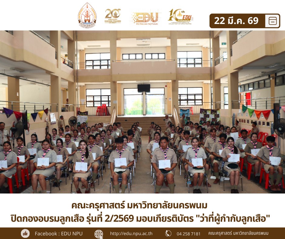 คณะครุศาสตร์ มหาวิทยาลัยนครพนม ร่วมกับ สโมสรลูกเสือริมฝั่งโขงนครพนม จัดพิธีปิดกองและมอบเกียรติบัตรอย่างสมเกียรติ ในโครงการฝึกอบรมผู้กำกับลูกเสือสามัญ ขั้นความรู้เบื้องต้น รุ่นที่ 2 ประจำปี 2569 สำหรับนักศึกษาชั้นปีที่ 3 (รหัส 66) หลังจากผ่านการอบรมในระยะเวลา 3 วันที่ผ่านมา