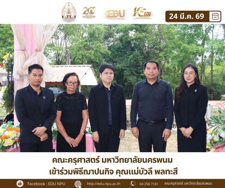 ผู้ช่วยศาสตราจารย์ ดร.เกรียงไกร ผาสุตะ คณบดีคณะครุศาสตร์ มอบหมายให้ ผศ.ดร.ธนเทพ ปะตังถาเน รองคณบดีฝ่่ายวิจัย บริการวิชาการ และกิจการพิเศษ เป็นตัวแทนคณะครุศาสตร์ มหาวิทยาลัยนครพนม ในการถวายผ้าไตรและดอกไม้จันทร์ในพิธีฌาปนกิจของ คุณแม่บัวลี พลทะสี ซึ่งท่านเป็นคุณแม่ของ นางแหวน อินพา (แม่บ้านคณะครุศาสตร์) และเป็นคุณยายของ นางสายชล วงค์ใหญ่ (หัวหน้าแผนกงานวิชาการ คณะครุศาสตร์) พร้อมด้วย อาจารย์และเจ้าหน้าที่ คณะครุศาสตร์ มหาวิทยาลัยนครพนม